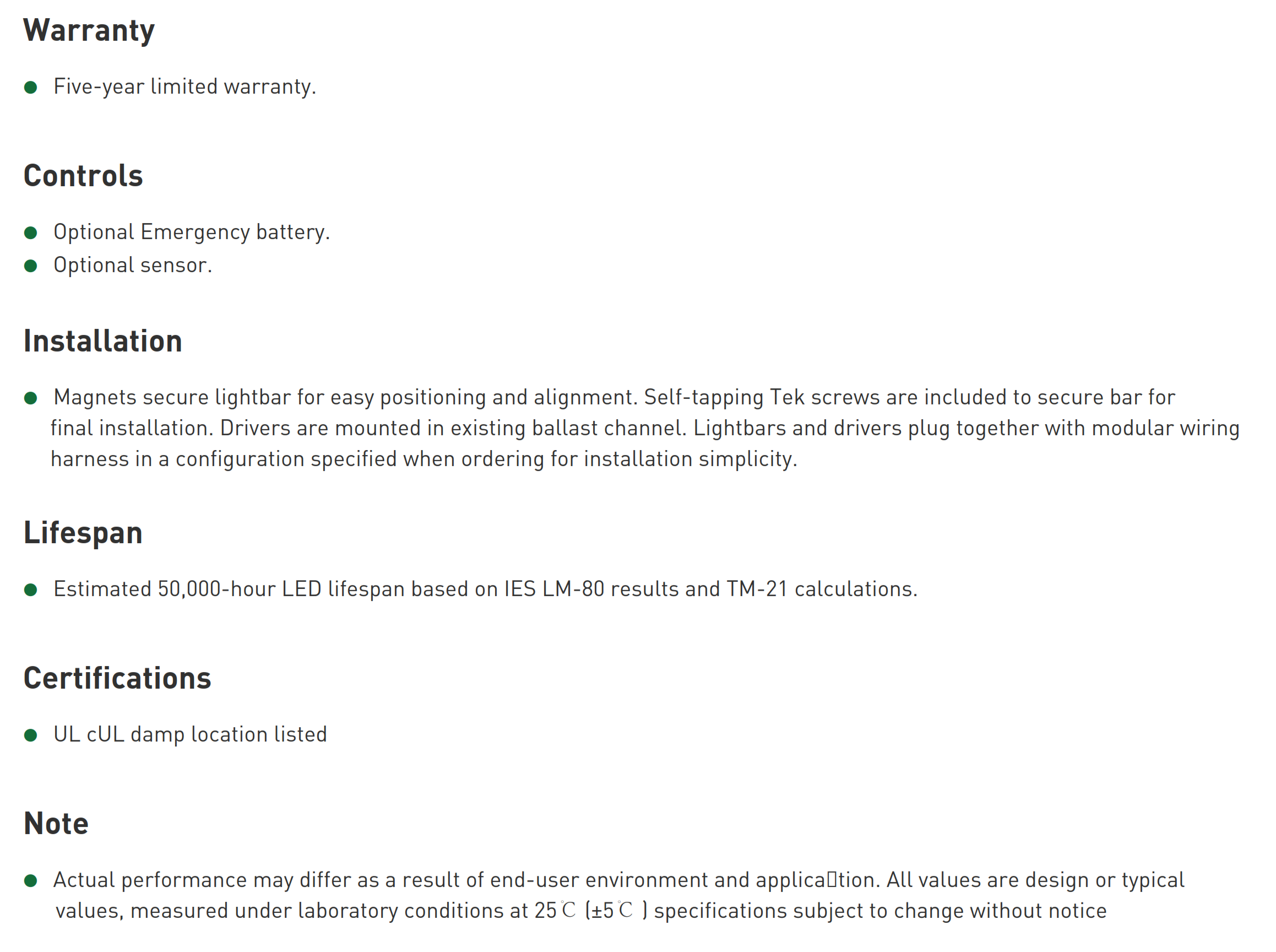 ▪Long life LEDs provide at least 70% of initial lumen output (L70) for 148,000 hours of operation, and at least 90% of initial