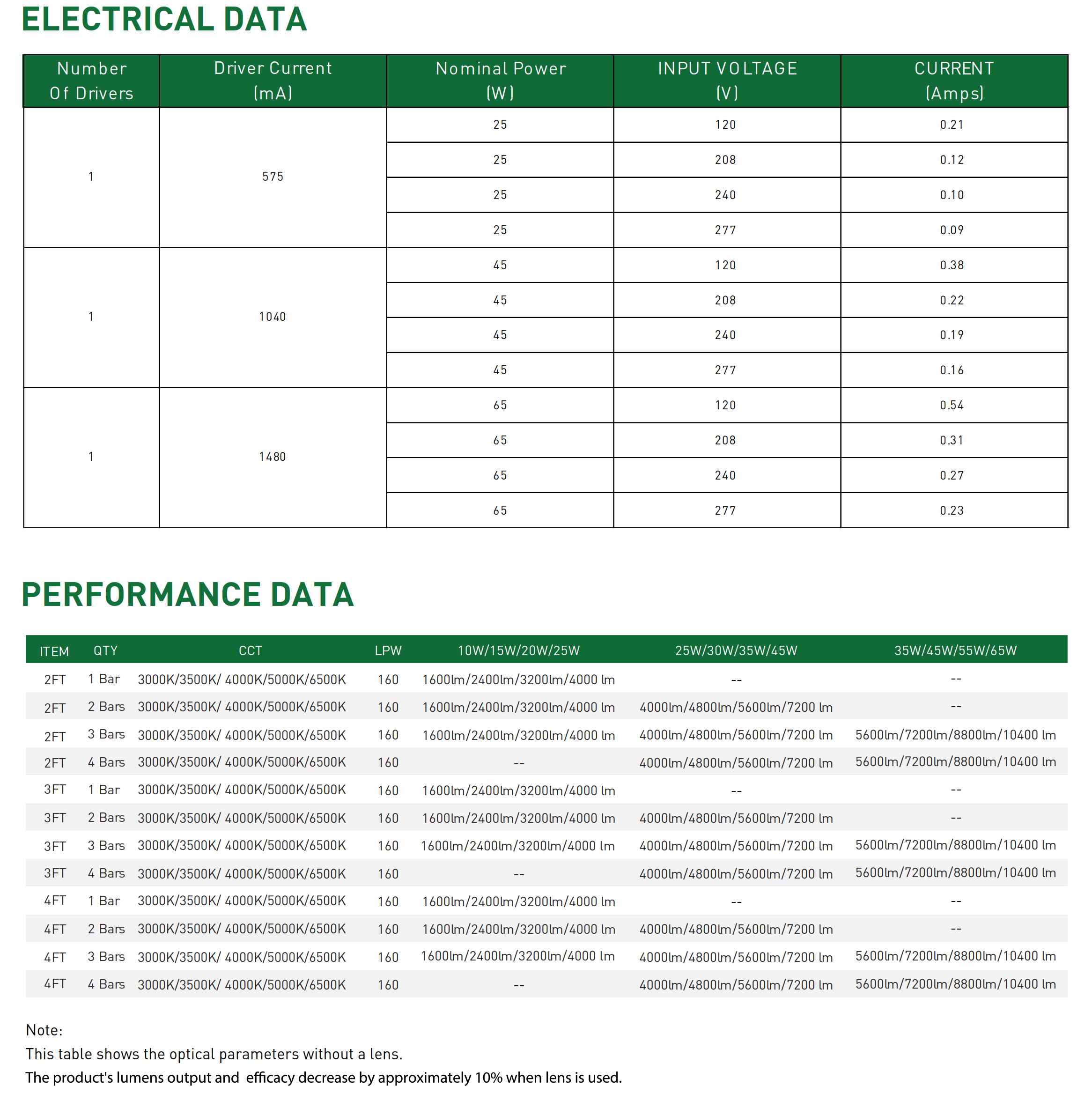 ●Voltage:100-277V/60Hz●Lumen Efficiency:Luminous Efficiency: >150 lm/w LED module, 100-125 lm/w Luminaire●Power Factor:up to 0.998●CCT:3000, 3500, 4000, 5000K●CRI (Ra):80 nominal●Mounting method:Magnetic led strips and driver, quick-connect ●Replacements: Retrofit 2’ x 2’, 1’ x 4’, and 2’ x 4’ “troffers” and 4’ and 8’ linear fluorescent fixtures●Dimmable is also available●Frost lens is available