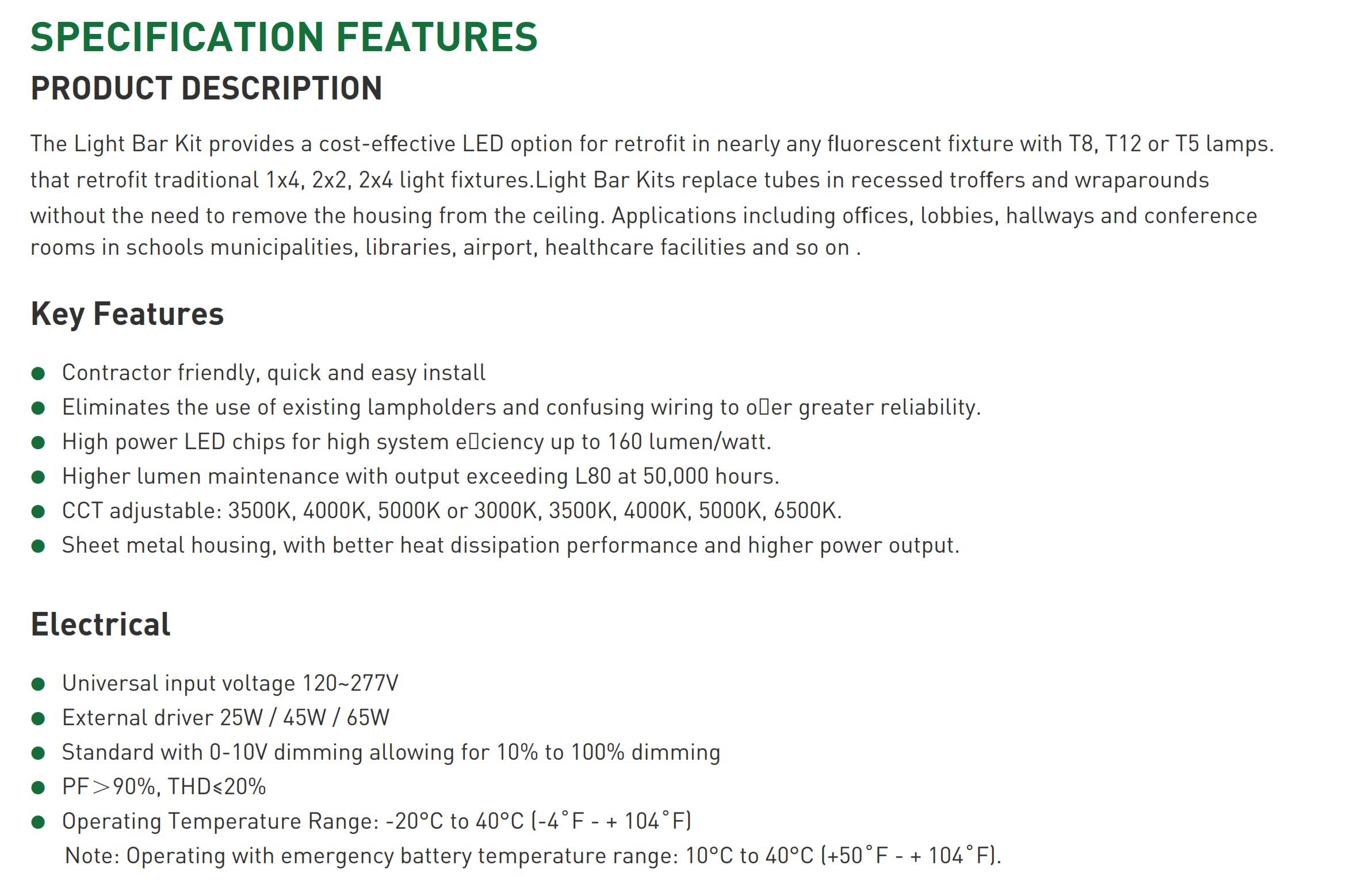 The Light Bar Kit provides a cost-effective LED option for retrofit in nearly any fluorescent fixture with T8, T12 or T5 lamps. that retrofit traditional 1x4, 2x2, 2x4 light fixtures.Light Bar Kits replace tubes in recessed troffers and wraparounds without the need to remove the housing from the ceiling. Applications including offices, lobbies, hallways and conference rooms in schools municipalities, libraries, airport, healthcare facilities and so on .
