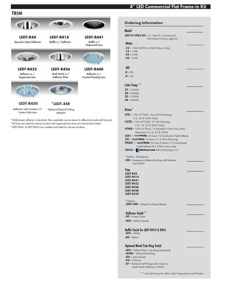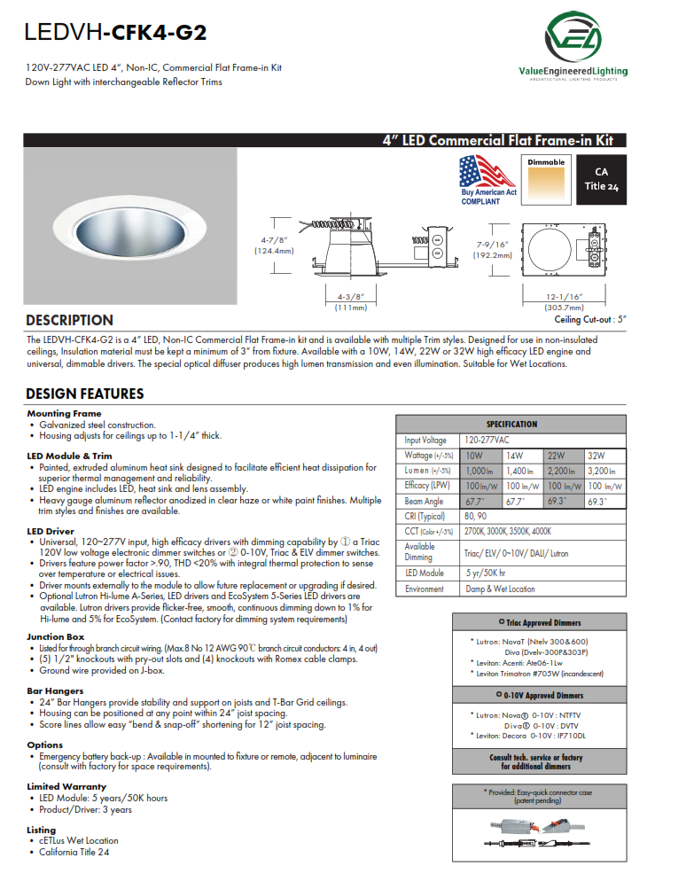 • The VLEDH-CFK4 is a 4” LED, Non-IC Commercial Flat Frame-in kit and is available with multiple Trim styles. Designed for use in non-insulated ceilings, Insulation material must be kept a minimum of 3” from fixture. Available with a 14W or 23W, high efficacy LED engine and universal, dimmable drivers. The special optical diffuser produces high lumen transmission and even illumination. Suitable for Wet Locations.