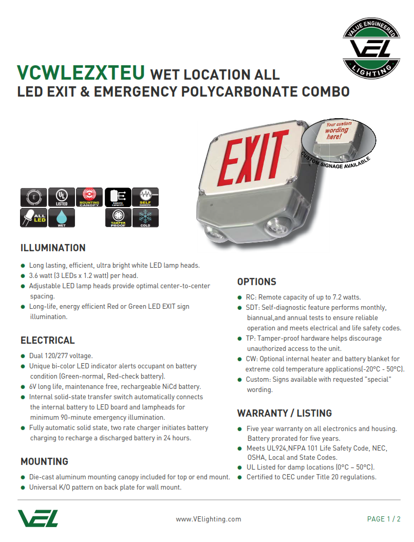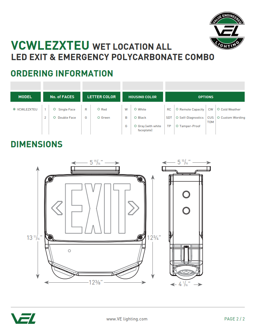 • WET LOCATION ALL LED EXIT & EMERGENCY POLYCARBONATE COMBO VCWLEZXTEU