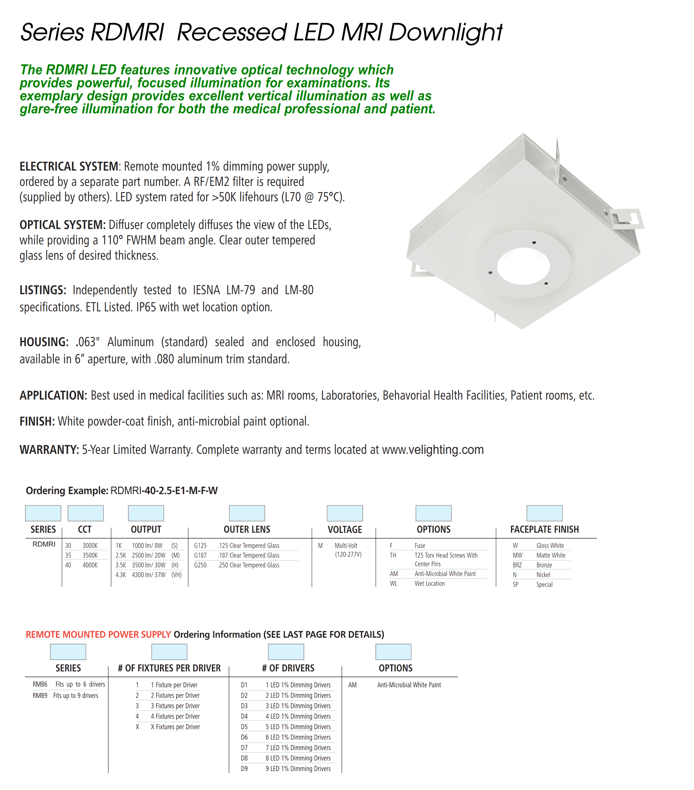 • The RDMRI LED features innovative optical technology which provides powerful, focused illumination for examinations. Its exemplary design provides excellent vertical illumination as well as glare-free illumination for both the medical professional and patient. Recessed LED MRI Downlight Recessed LED MRI Downlight Recessed LED MRI Downlight
