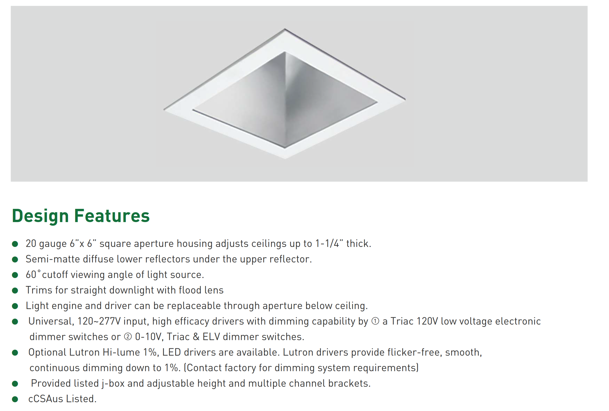 • 120-277 VAC, 6″ X 6″ Non-IC Type LED Square Architectural Downlight