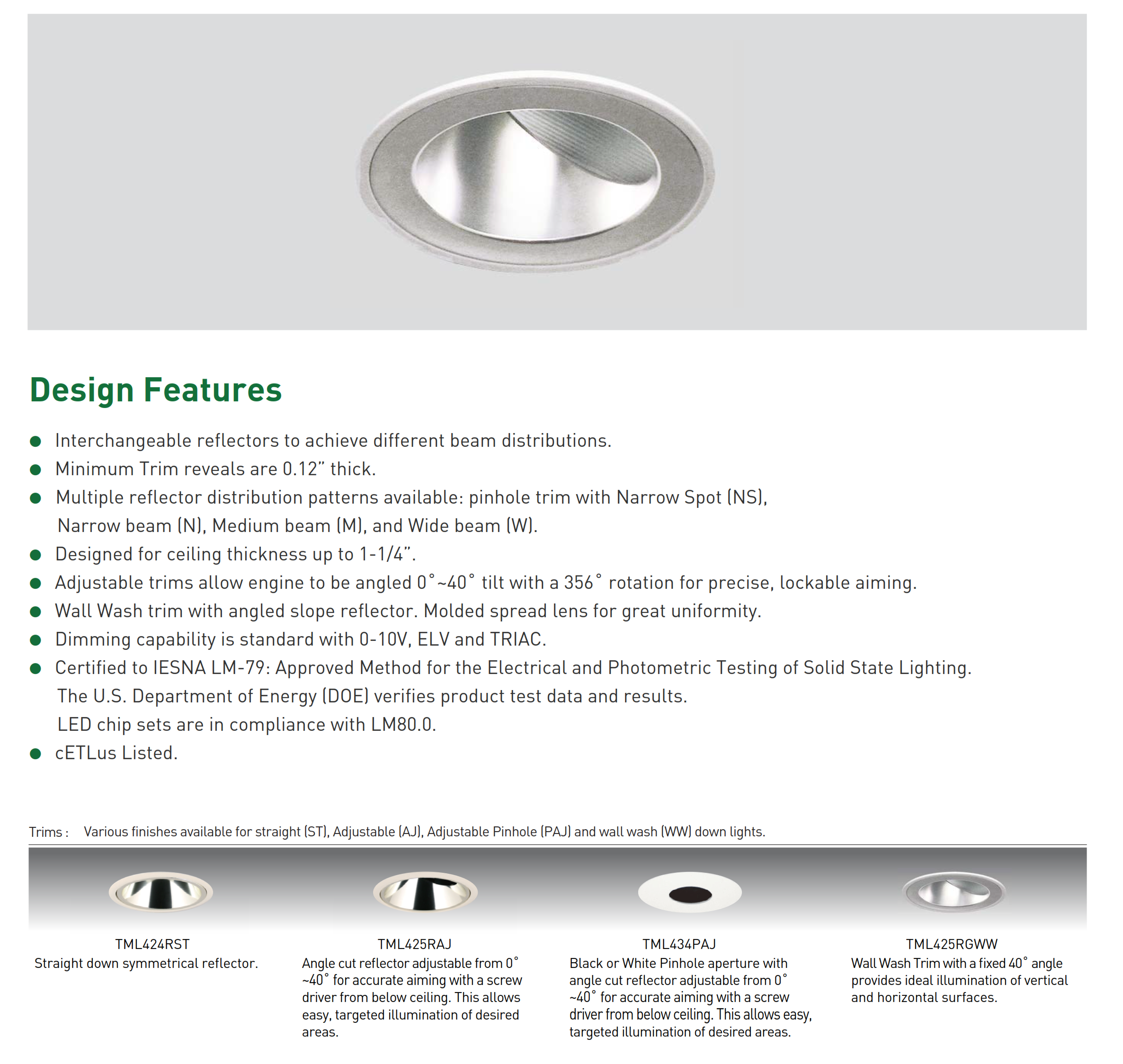 • Wall Wash trim with angled slope reflector. Molded spread lens for great uniformity.