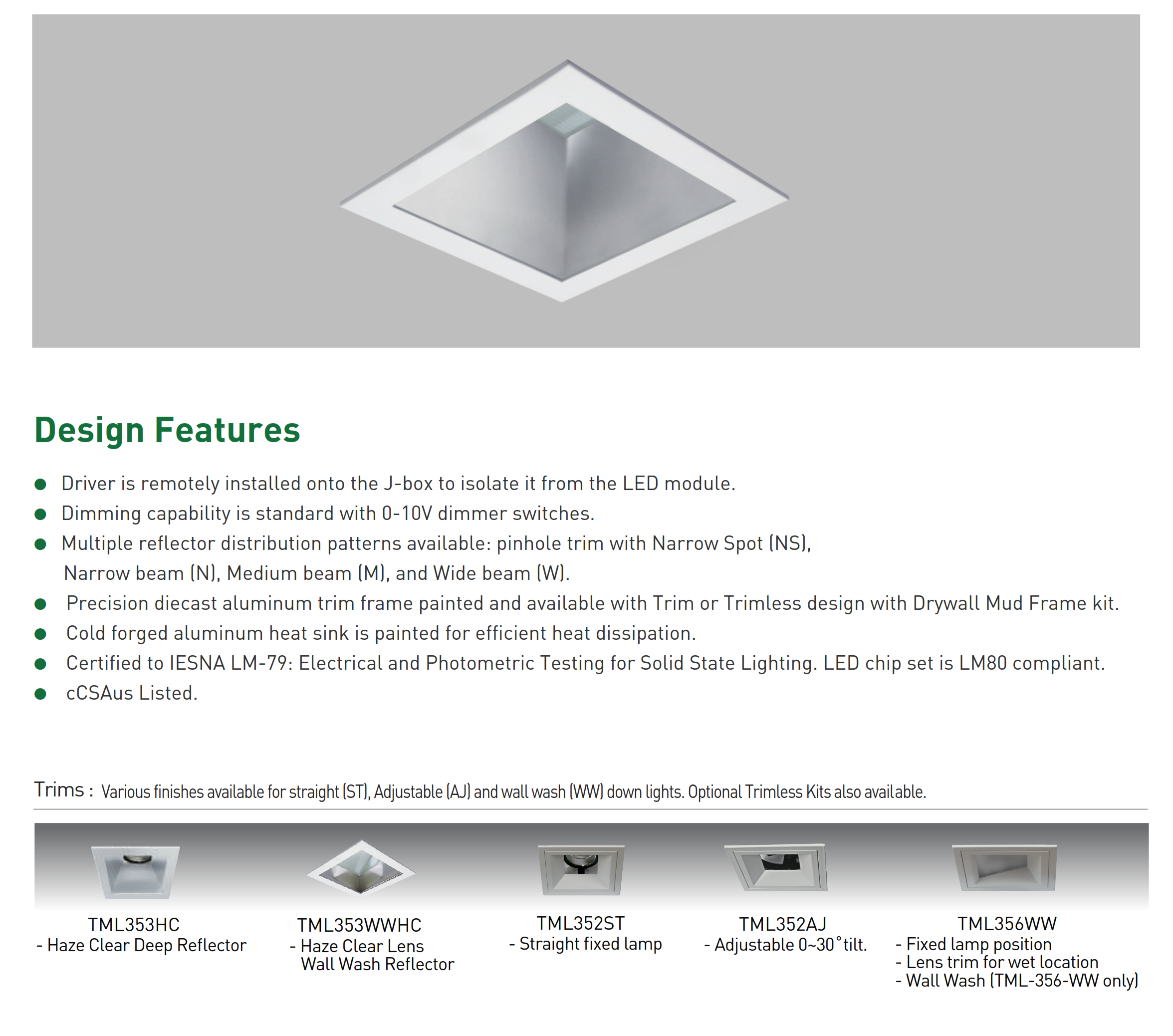 • Certified to IESNA LM-79: Electrical and Photometric Testing for Solid State Lighting. LED chip set is LM80 compliant.