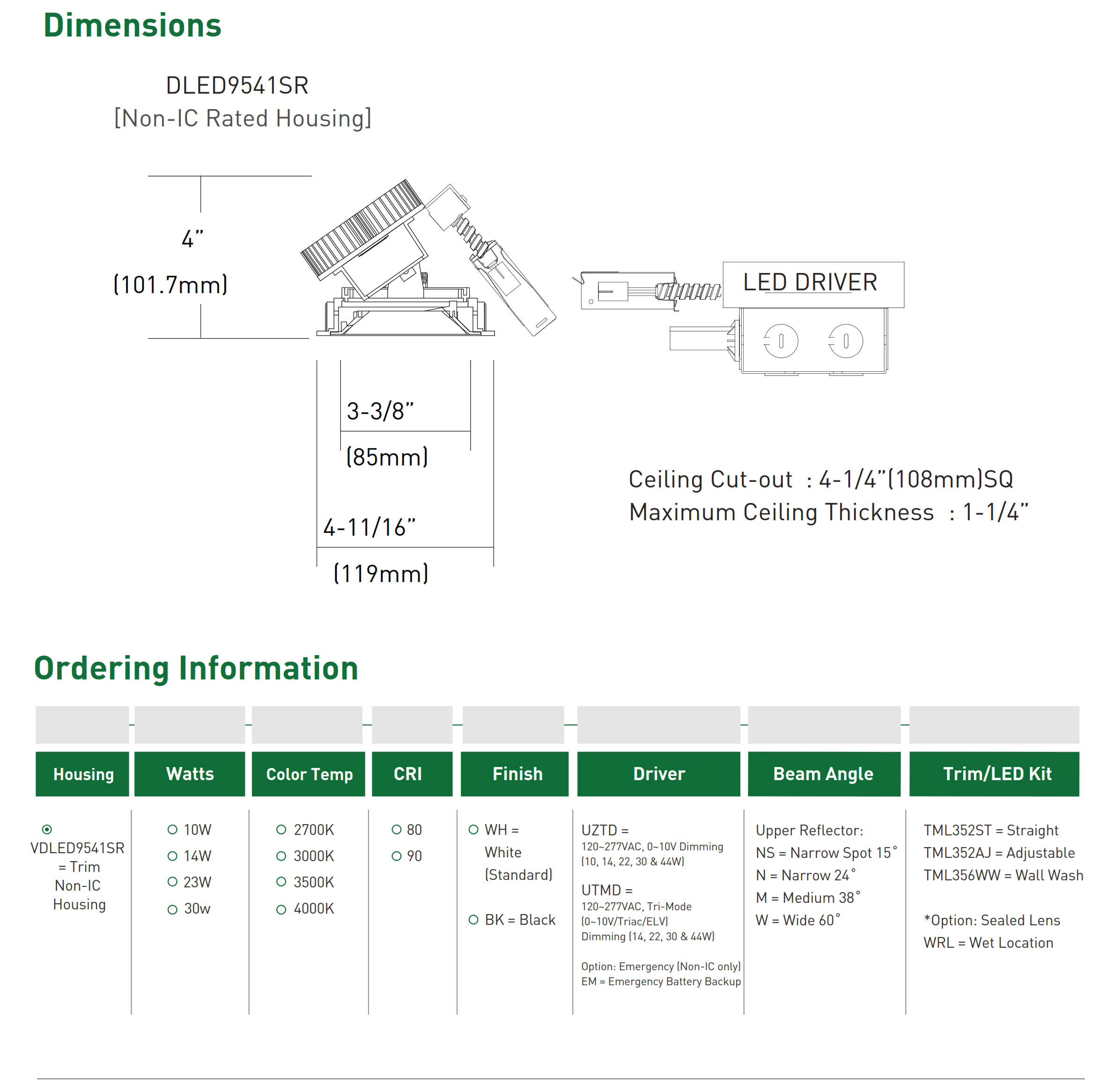 • • Light-weight aluminum housing, adjusts for ceilings up to 1-1/4” thick.• Driver is remotely installed onto the J-box to isolate it from the LED module. • Dimming capability is standard with 0-10V dimmer switches.• Multiple reflector distribution patterns available: pinhole trim with Narrow Spot (NS), Narrow beam (N), Medium beam (M), and Wide      beam (W).• Certified to IESNA LM-79: Electrical and Photometric Testing for Solid State Lighting. LED chip set is LM80 compliant.• Precision diecast aluminum trim frame painted and available with Trim or Trimless design with Drywall Mud Frame kit.• Cold forged aluminum heat sink is painted for efficient heat dissipation.• cETLus Listed.• The ICED95331S luminaire is listed as Type IC and is suitable for direct contact with insulation. VICED95331S 3.6” X 3.6” IC and Non-IC Square Architectural LED Series Downlight • Light-weight aluminum housing, adjusts for ceilings up to 1-1/4” thick.• Driver is remotely installed onto the J-box to isolate it from the LED module. • Dimming capability is standard with 0-10V dimmer switches.• Multiple reflector distribution patterns available: pinhole trim with Narrow Spot (NS), Narrow beam (N), Medium beam (M), and Wide      beam (W).• Certified to IESNA LM-79: Electrical and Photometric Testing for Solid State Lighting. LED chip set is LM80 compliant.• Precision diecast aluminum trim frame painted and available with Trim or Trimless design with Drywall Mud Frame kit.• Cold forged aluminum heat sink is painted for efficient heat dissipation.• cETLus Listed.• The ICED95331S luminaire is listed as Type IC and is suitable for direct contact with insulation. VICED95331S 3.6” X 3.6” IC and Non-IC Square Architectural LED Series Downlight