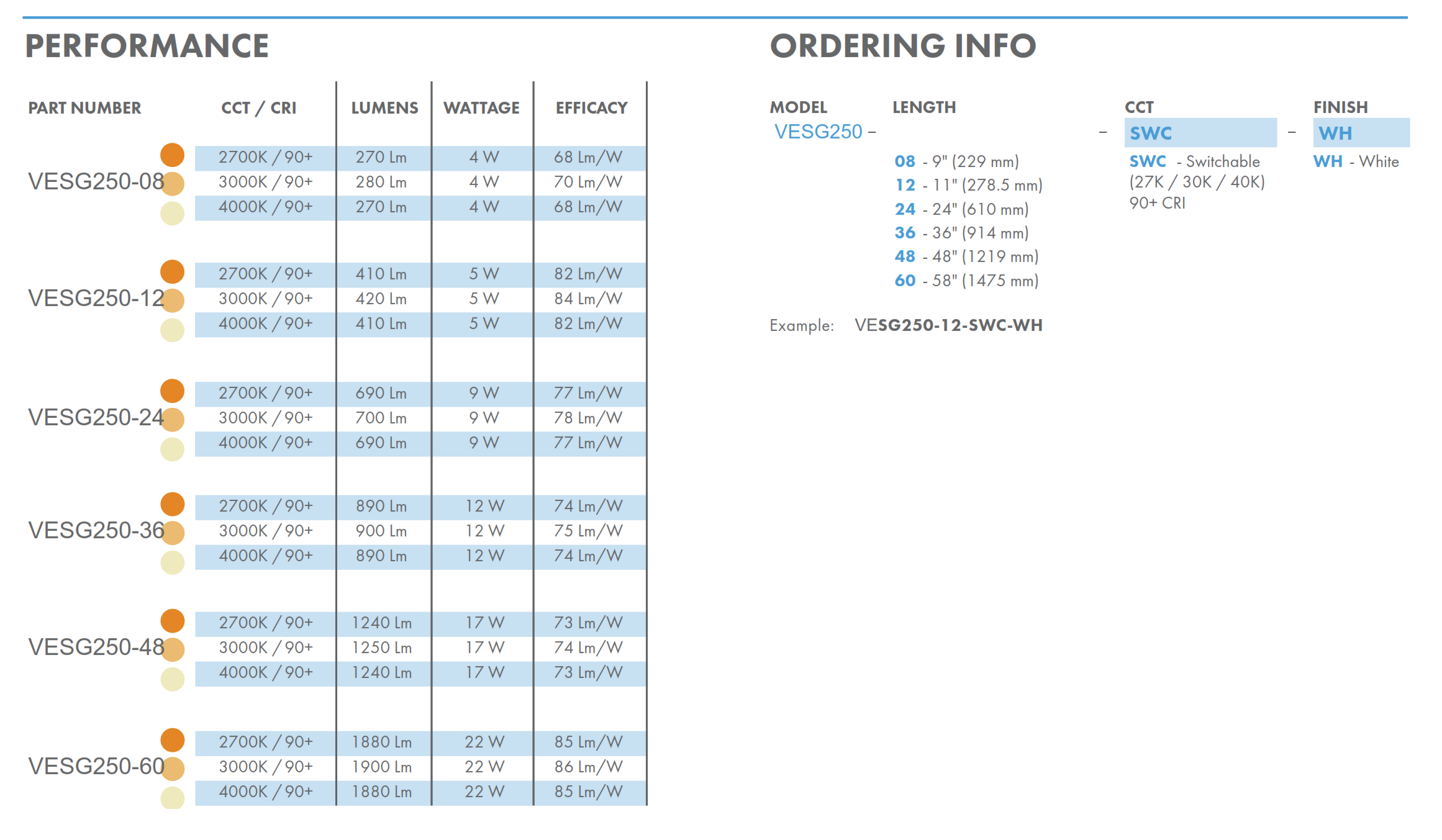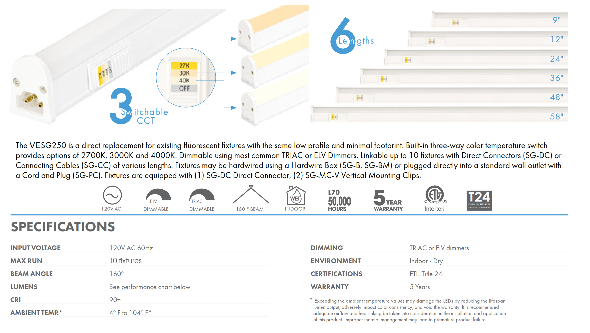 The VESG250 is a direct replacement for existing fluorescent fixtures with the same low profile and minimal footprint. Built-in three-way color temperature switch provides options of 2700K, 3000K and 4000K. Dimmable using most common TRIAC or ELV Dimmers. Linkable up to 10 fixtures with Direct Connectors (SG-DC) or