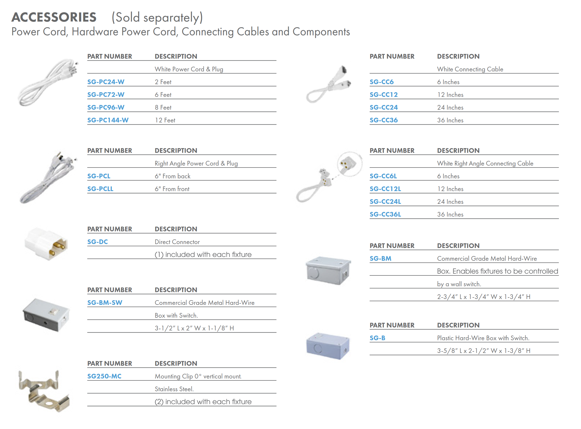 Connecting Cables (SG-CC) of various lengths. Fixtures may be hardwired using a Hardwire Box (SG-B, SG-BM) or plugged directly into a standard wall outlet with a Cord and Plug (SG-PC). Fixtures are equipped with (1) SG-DC Direct Connector, (2) SG-MC-V Vertical Mounting Clips.
