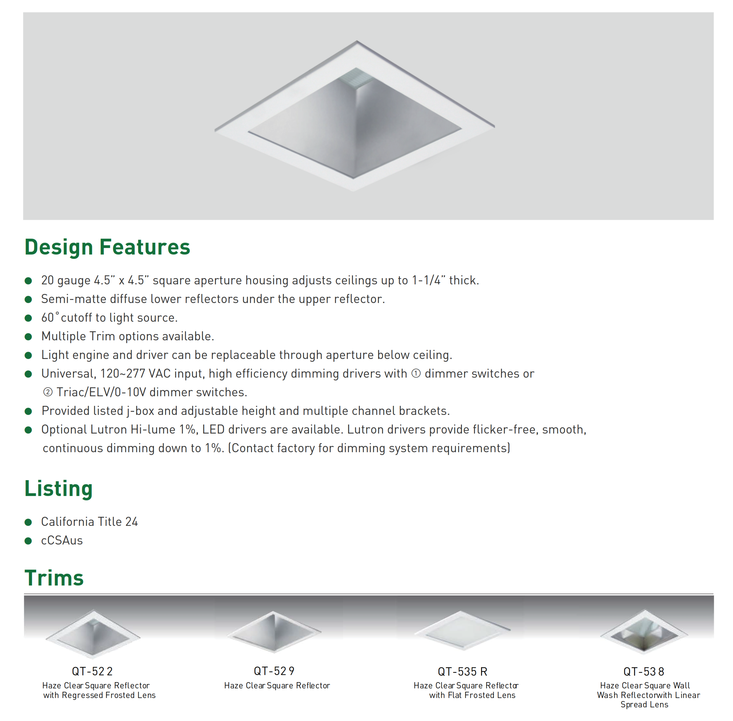 • cETLus Listed. 120-277 VAC, 4″ X 4″ IC Type LED Square Architectural Downlight