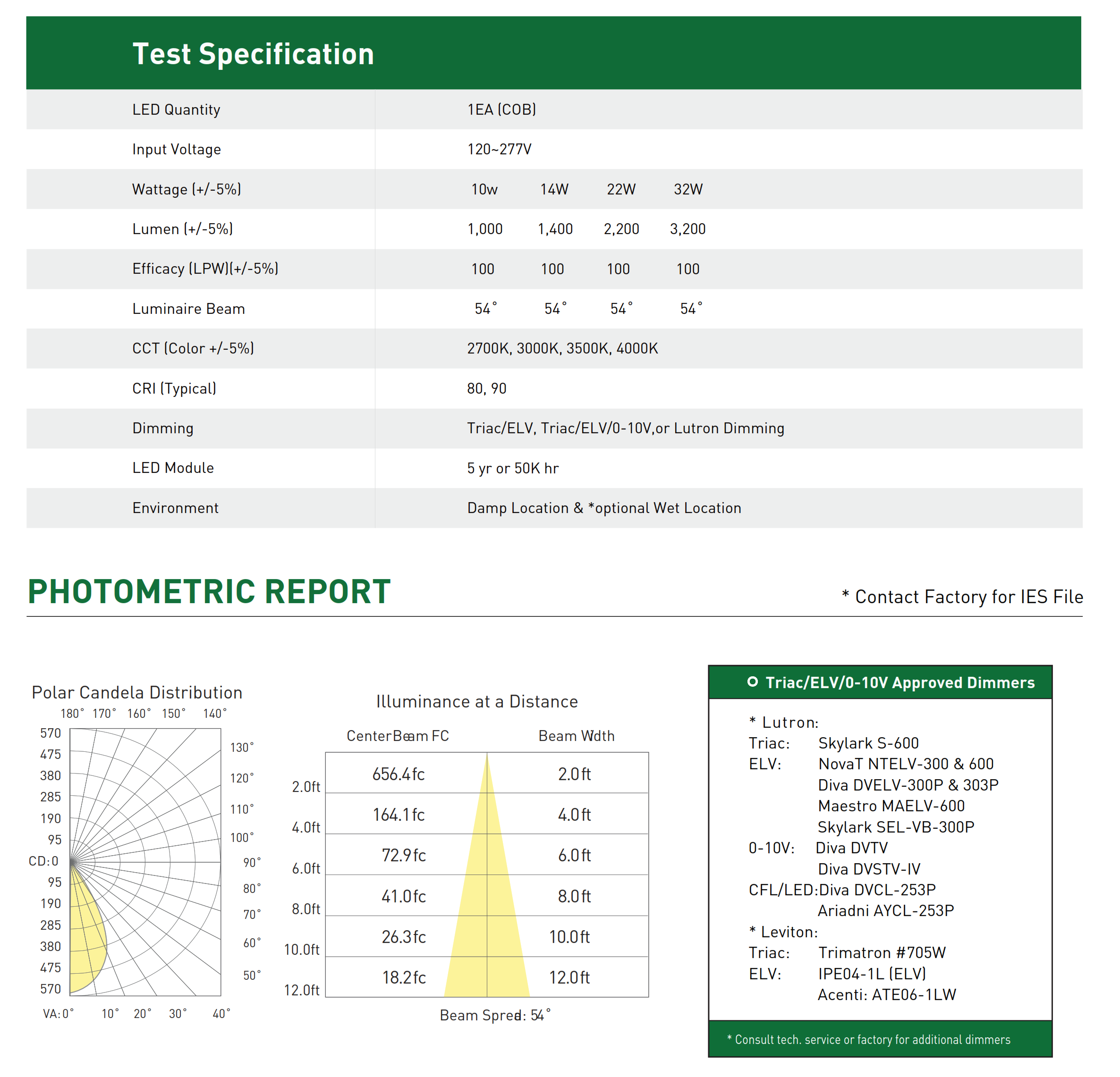• Universal, 120~277V input, high efficacy drivers with dimming capability by a Triac 120V low voltage electronic dimmer switches or 0-10V, Triac & ELV dimmer switches.