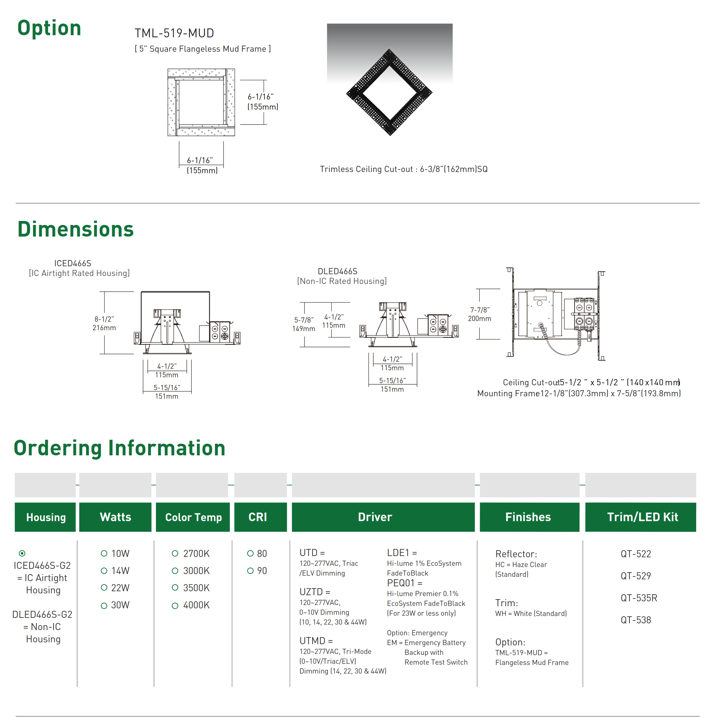 • cETLus Listed. VDLED666S-G2 Square Architectural Recessed Downlight 120-277 VAC, 6″ X 6″ Non-IC Type LED Square Architectural Downlight